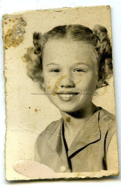Black & white school photograph of a young girl. She has blond, curly hair pulled back on the sides of her head and is wearing a blouse with an open neck. On the back is written, "Vicky from Norma".