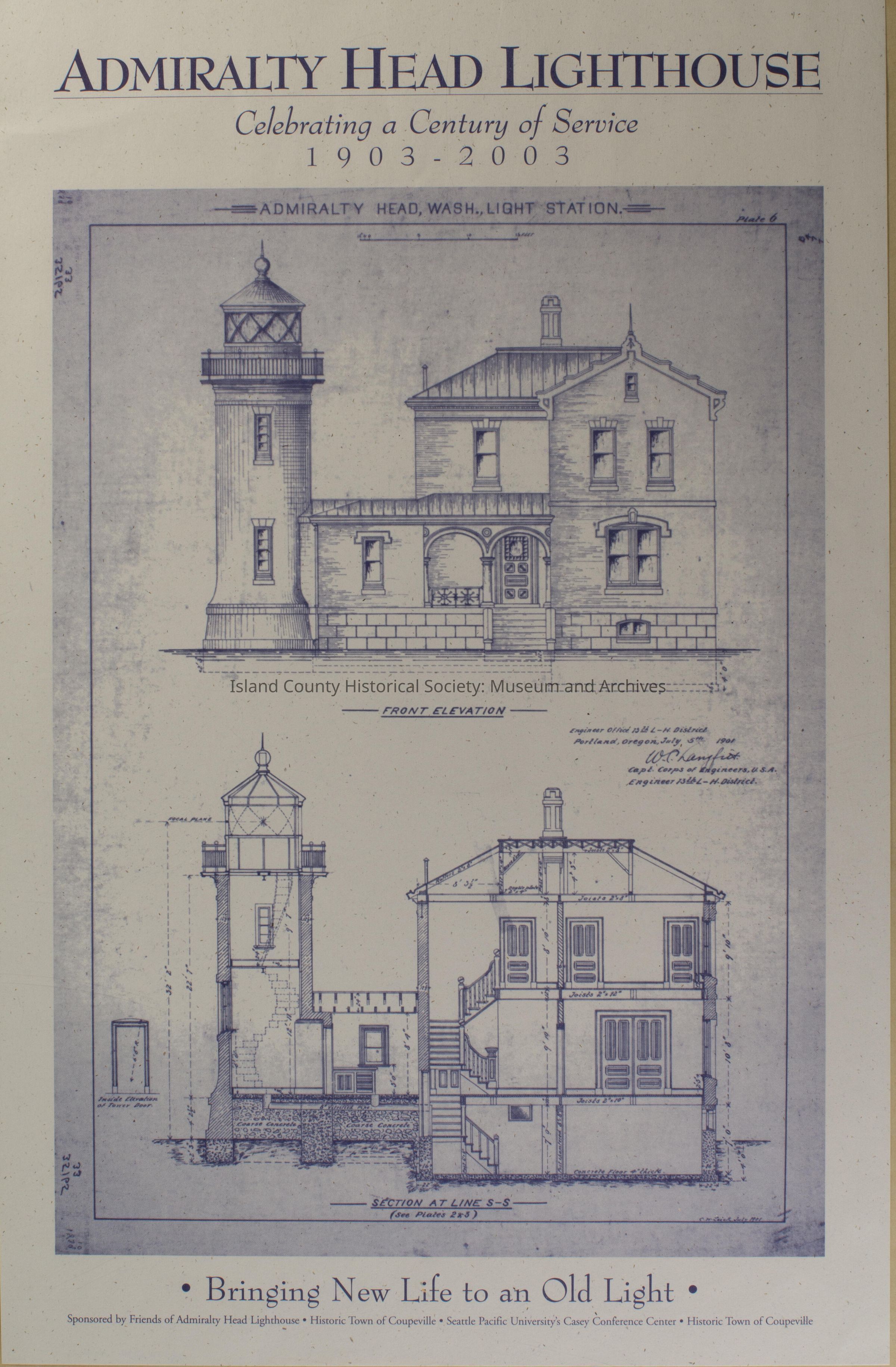 Cream poster or advertisment for Admiralty Head Lighthouse. Celebrating a Century of Service, 1903-2003. The main portion is a schematic drawing of the lighthouse with the front elevation and inside section. Sponsored by: Friends of Admiralty Head Lighthouse, Historic Town of Coupeville, Seattle Pacific Univeristy's Casey Conference Center.Lexicon
