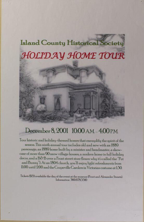 White poster for the Island County Historical Society Holiday Home Tour, December 8, 2001. This was the 9th annual tour of places in Coupeville. On the tour were the following: 1889 parsonage, 1889 home built by minister and headmaster, holiday decor, B&B. Light refreshements at the 1894 church. Coupeville Carolers to entertain. The photo in the center is the Zylstra house near the Courthouse.Lexicon