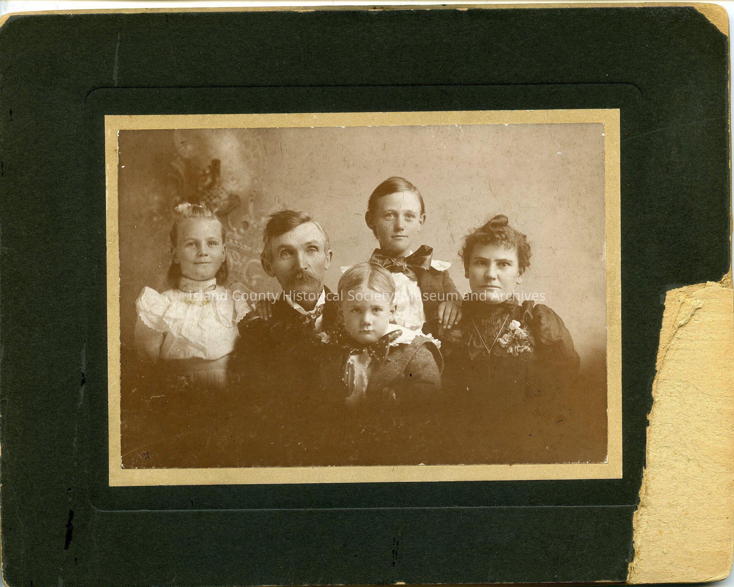 Formal portrait of couple with three children. Jerome Ely (1844-1923), first mayor of Oak Harbor, Clarabelle Ely, Serena, Vernon, and Leo.