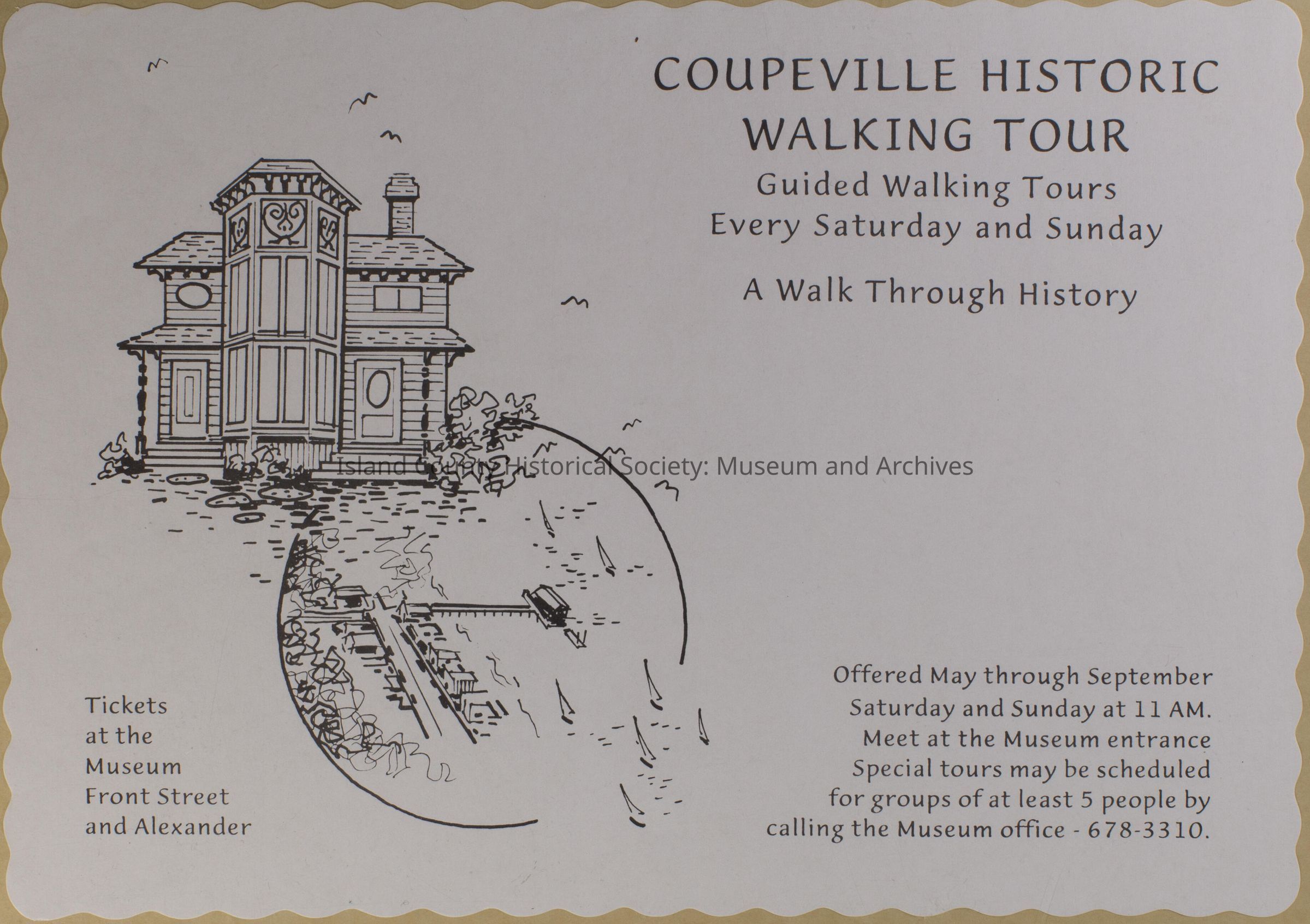 White poster for the Island County Historical Society Coupeville Historic Walking Tour, On the tour were the following: homes, restaurants, stores, and other locations. The tours were from May through September (no year on the poster). This poster has scalloped edges. A drawing of a house and the wharf are on the left.Lexicon