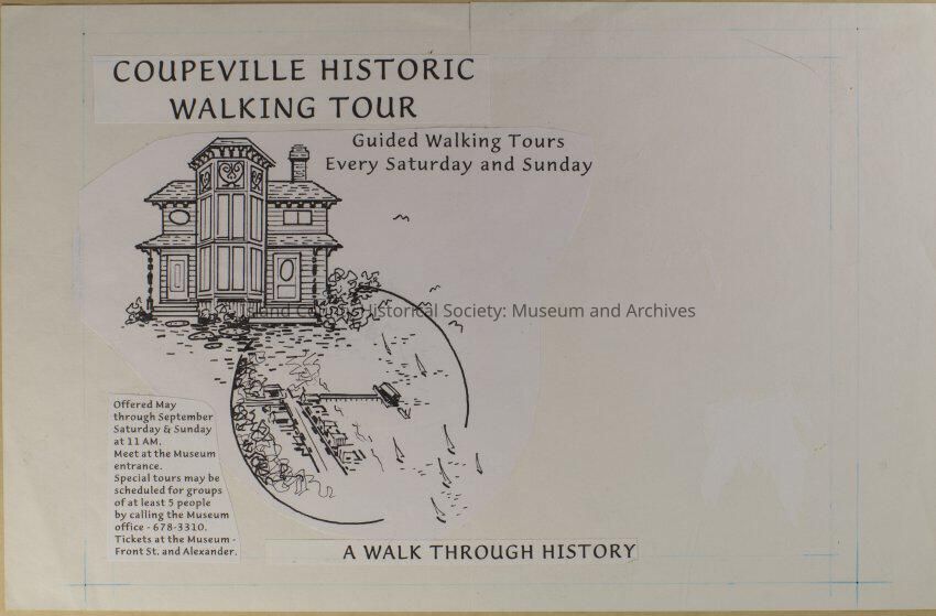 White poster for the Island County Historical Society Coupeville Historic Walking Tour, On the tour were the following: homes, restaurants, stores, and other locations. The tours were from May through September (no year on the poster). A drawing of a house and the wharf are on the left. A Walk Through History.Lexicon