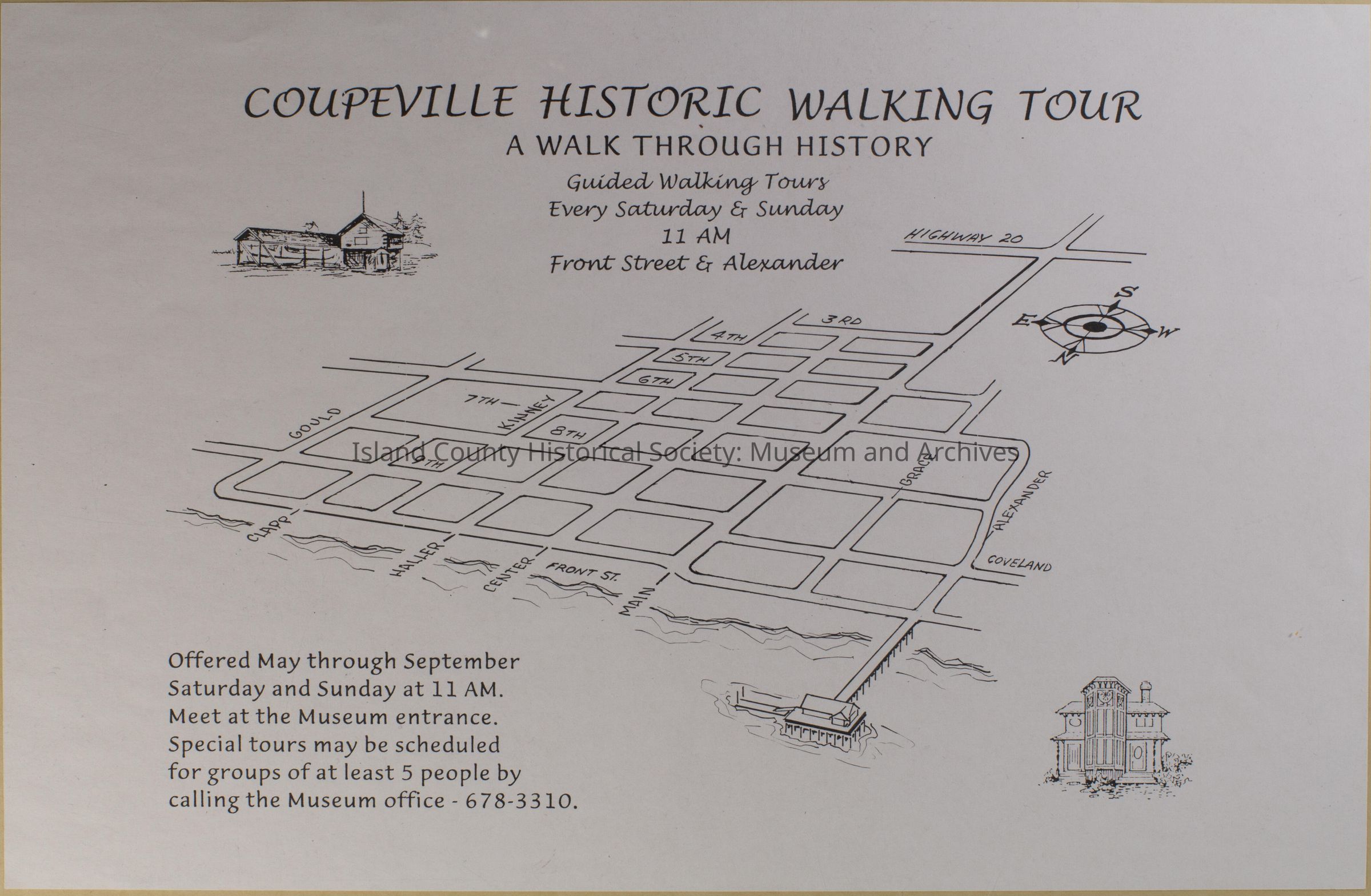 White poster for the Island County Historical Society Coupeville Historic Walking Tour, On the tour were the following: homes, restaurants, stores, and other locations. The tours were from May through September (no year on the poster). A drawing of a Alexander blockhouse is on the top left, in the center right is the wharf and a house is on the lower right. . A Walk Through History.Lexicon