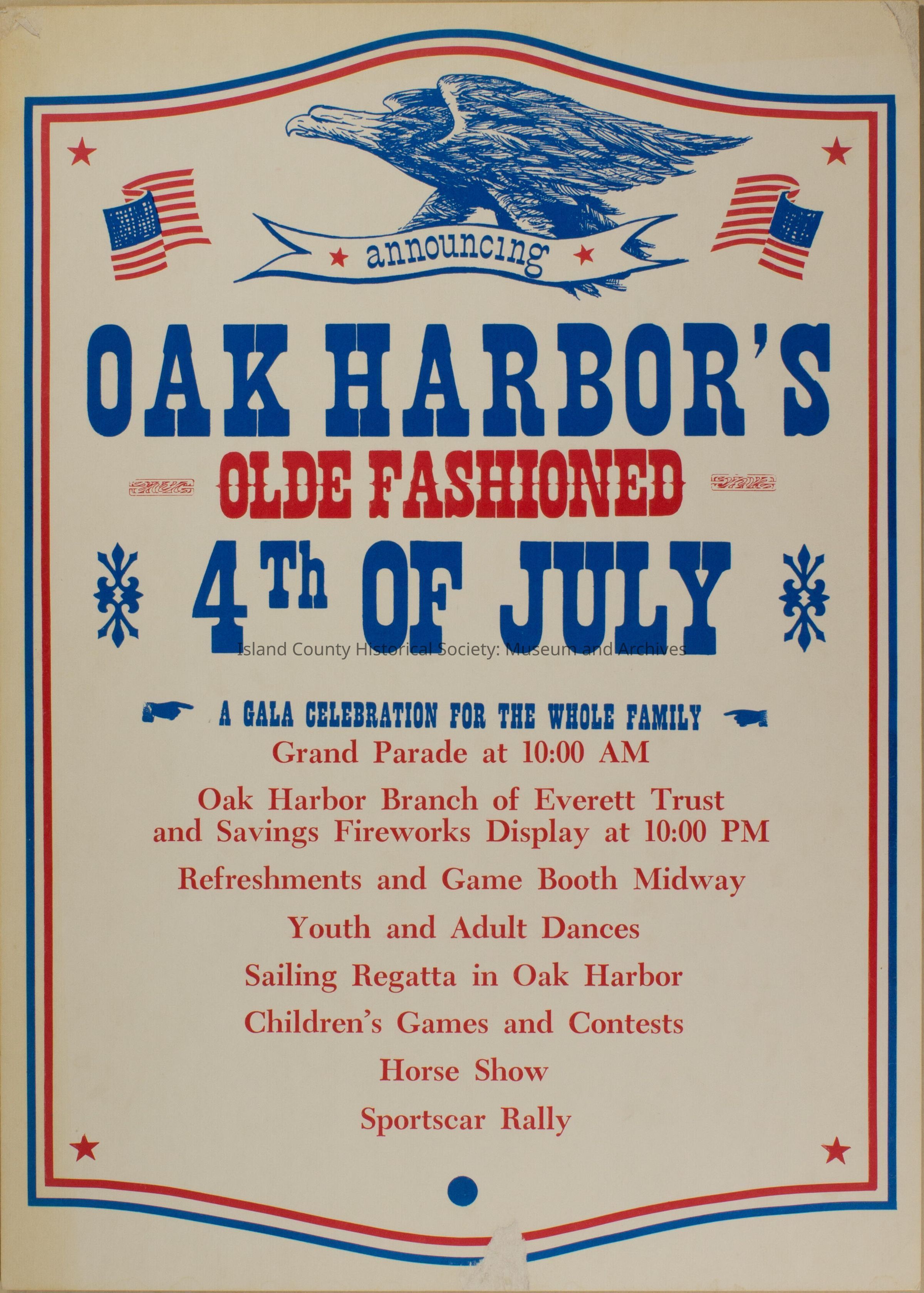 Red, white and blue poster for the Oak Harbor Olde Fashioned 4th of July (no year). Lists event: dancing, food, fireworks, parade, games, horse show and car rally.Lexicon