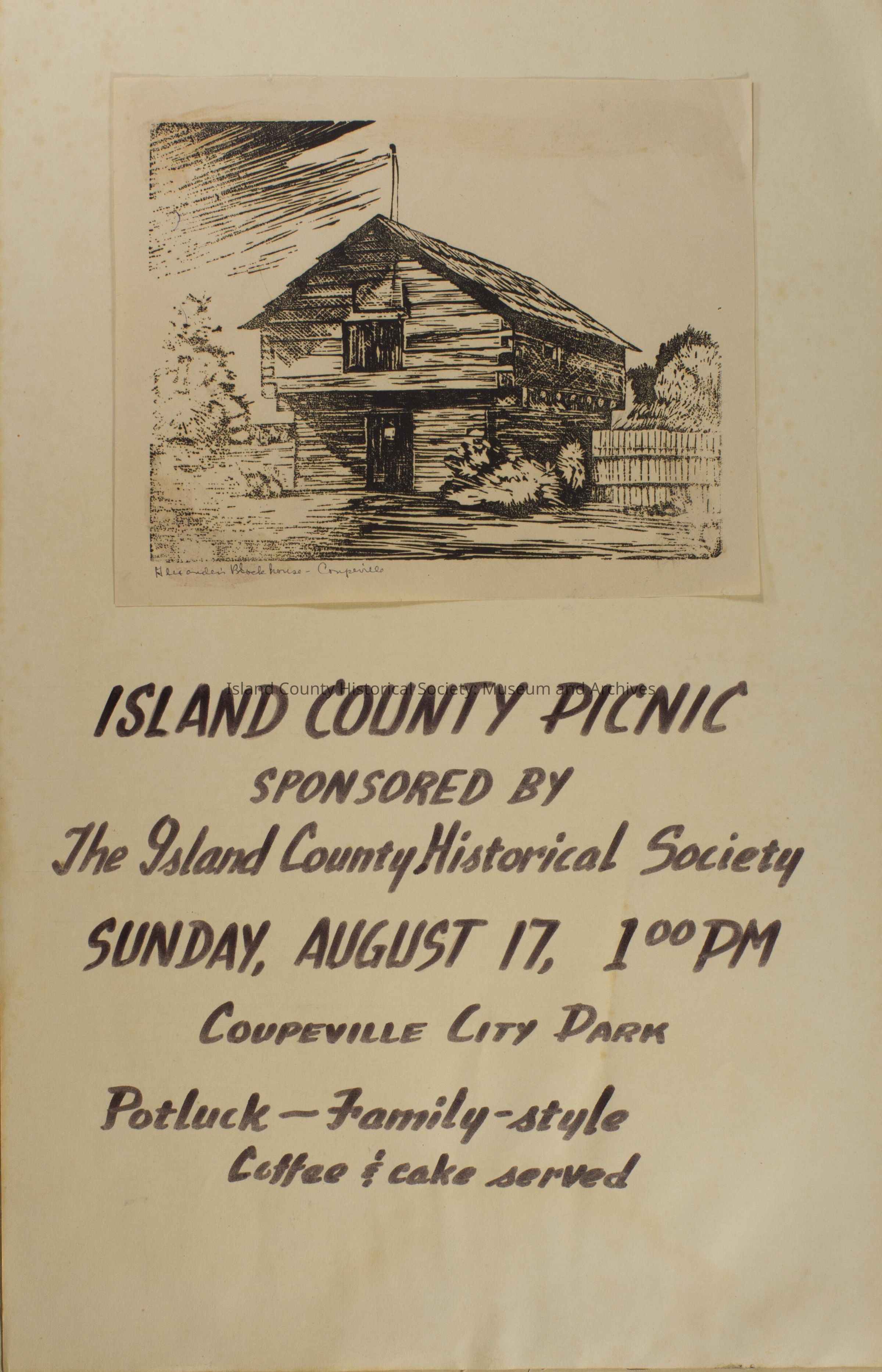 Cream poster for the Island County Picnic, sponsored by the Island Historical Society, August 17 (no year), at the City Park. Potluck, coffee and cake served. The drawing on the top is the Alexander Blockhouse.Lexicon