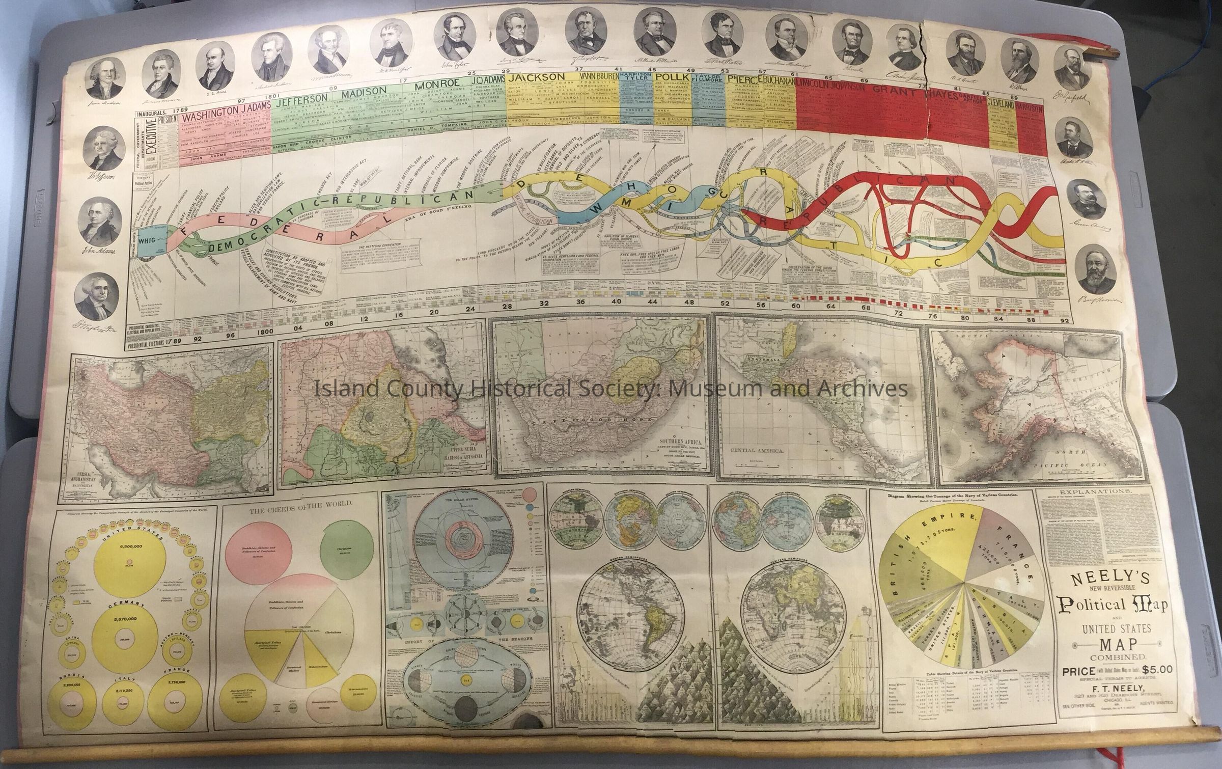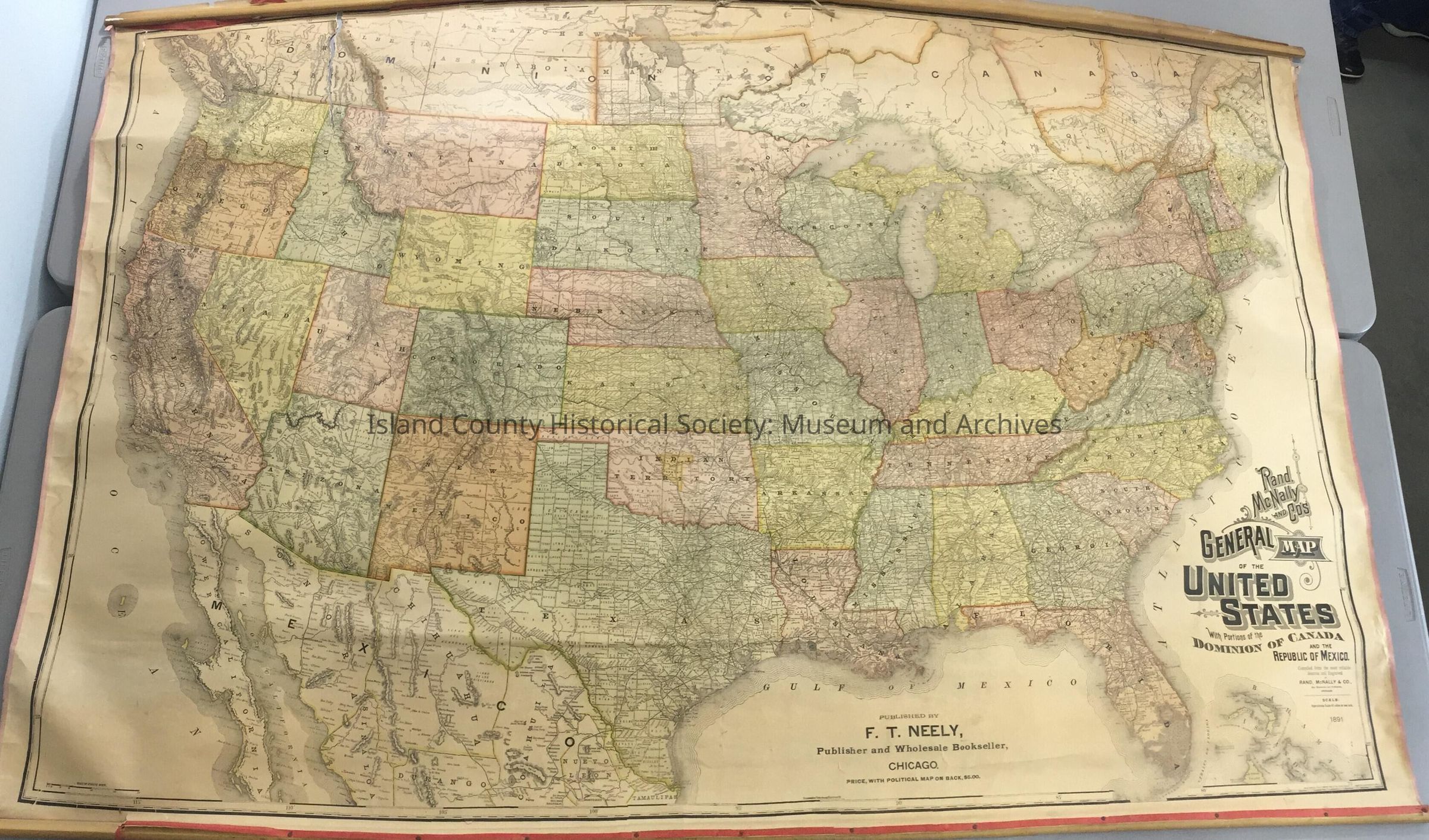 Rand McNally and Company General Map of the United States with Portions of the Dominion of Canada and the Republic of Mexico. 1891. Published by F. T. Neely, Chicago. Two sided map. Reverse side: photos of Presidents Washington through to Harrison, maps of solar system, Latin America, Alaska, South Africa, North Pacific Ocean, Southwest Asia, East Africa countries, creeds of the world, military strength, world navies tonnage.