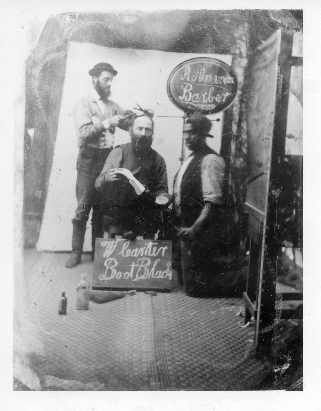 Capt. Thomas Kinney with Winston Carter and Abram Alexander. Pretending for a picture. Carter (kneeling) was a blacksmith originally from Canada. Alexander (standing) owned and ran a hotel. Signs read: A. Alexander, Barber and W. Carter, Boot Black. Photo donated by Lillian Dean Huffstetler.