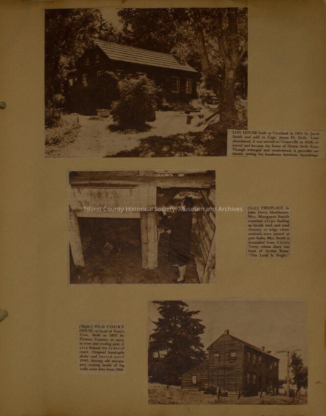 Coupeville Pioneer Buildings This page highlights three pioneer buildings to include; the log house built at Coveland in 1851 by Jacob Smith and ater sold to Capt. James Swift, the fireplace in the John Davis blockhouse, and the old courthouse at the head of Penn's Cove. Built in 1855 by Thomas Cranney to serve as store and trading post. Each clipping is featured in the Seattle Sunday Times Pacific Parade Magazine Section on Historic Whidby Island.
