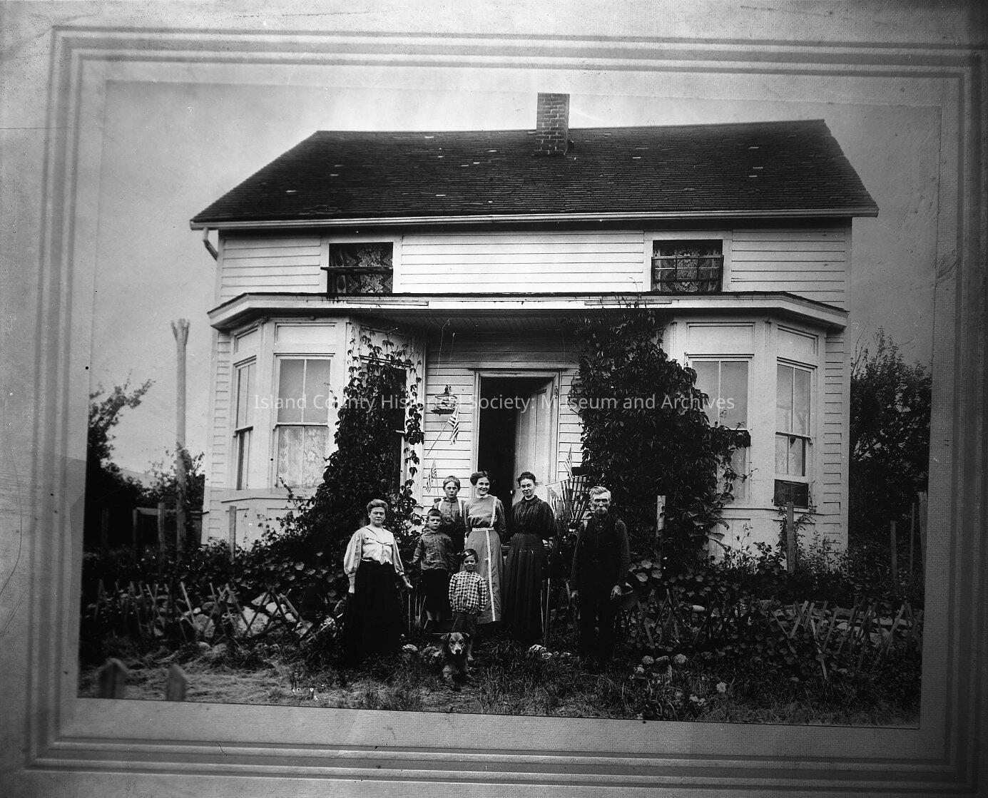 Ely Family in front of Ely House. Jerome Ely, three women and three children and dog. Garden surrounds them and vines climb up front wall. Door is in middle and stands open. Bay windows are on either side of door.