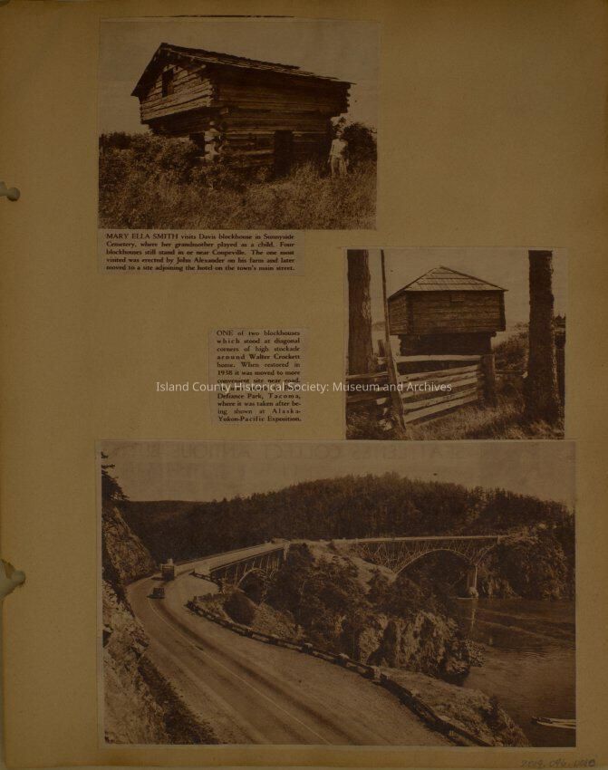 Coupeville Pioneer Buildings This page highlights three pioneer buildings to include; the Davis blockhouse in Sunnyside cementary, the Crockett blockhouse, and a picture of the Deception Pass Bridge. Each clipping is featured in the Seattle Sunday Times Pacific Parade Magazine Section on Historic Whidby Island.