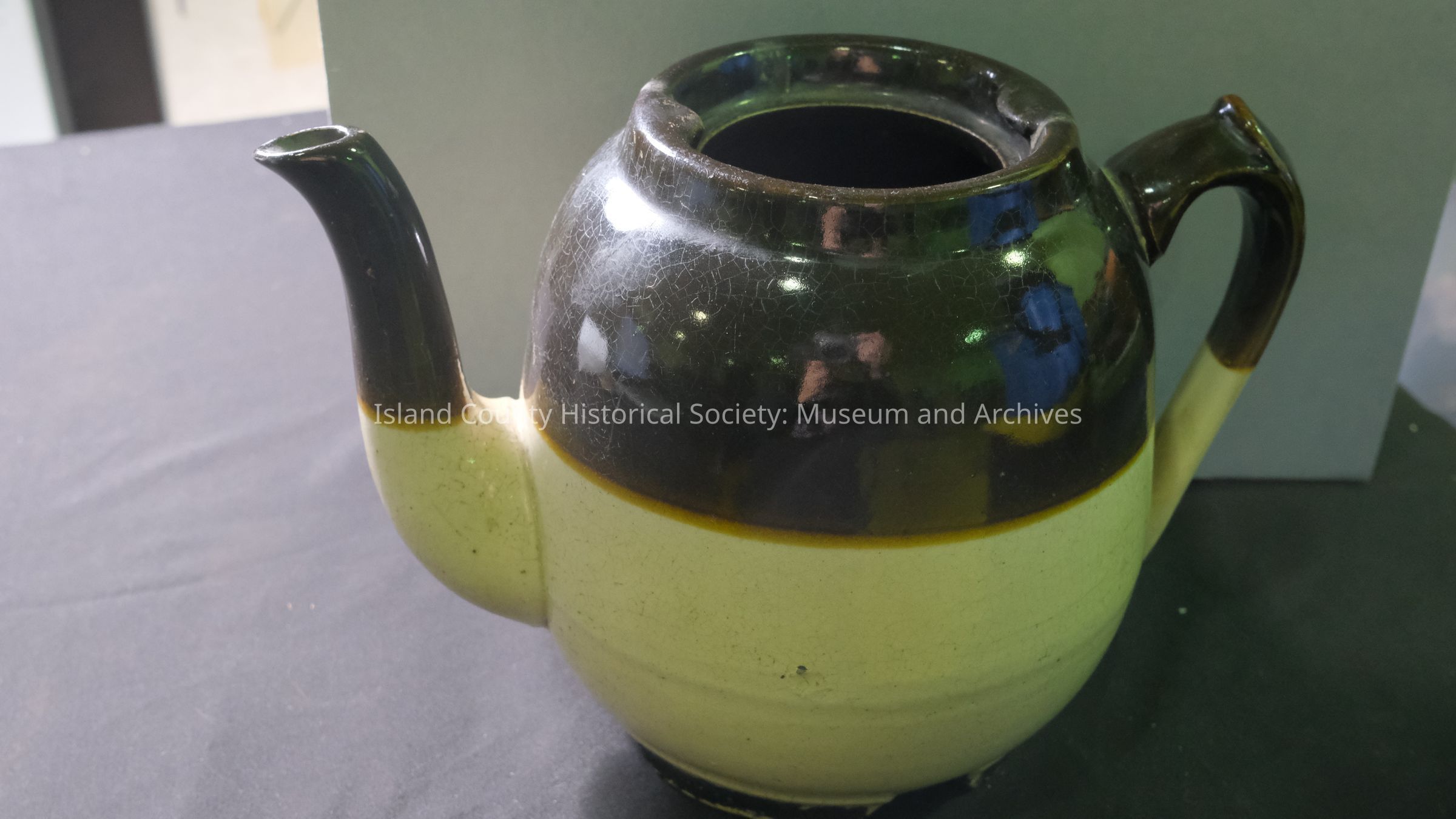 Teapot from Henry Race farm. Brown and tan granite teapot with no lid. Heavy crocker color - came with the Races from Australia - English made.