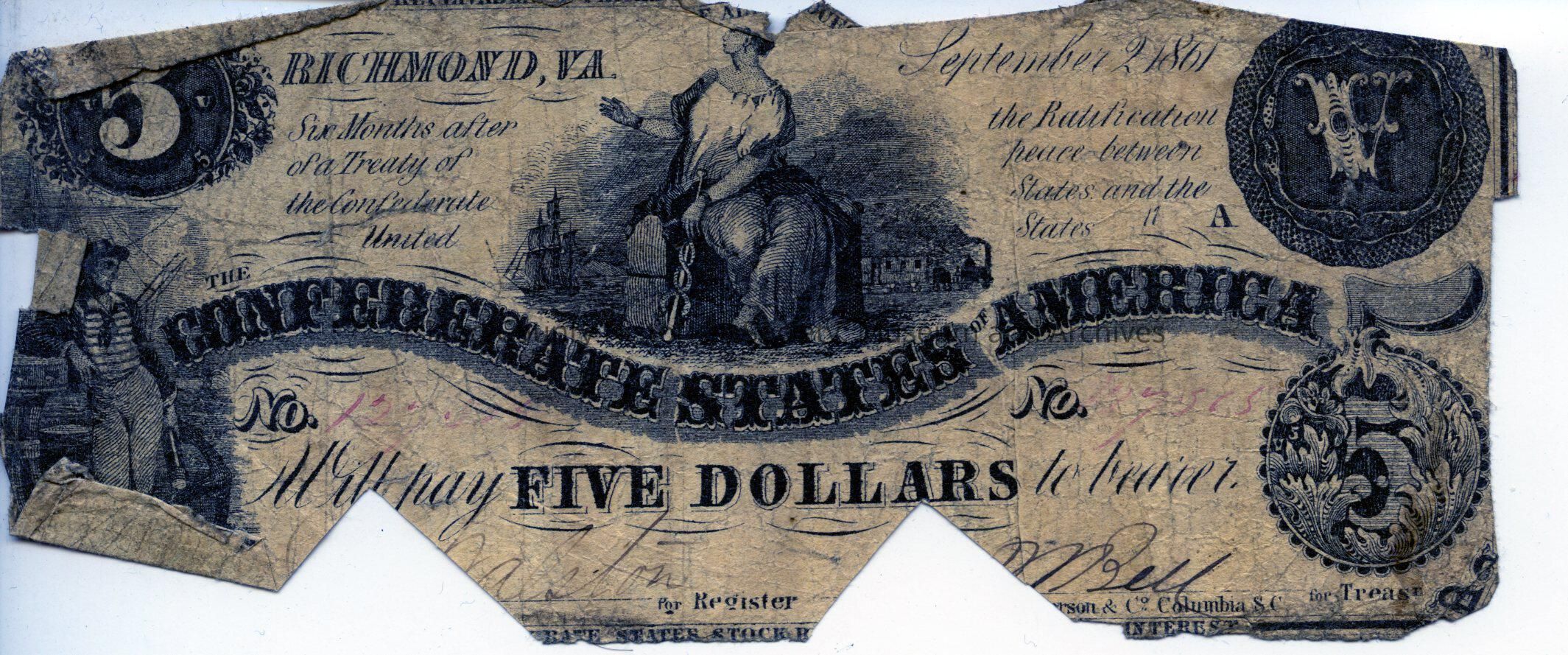 Confederate $5.00 dollar bill. No other information about where the money came from and was found in collection. Bill has an image of a sailor, commerce lady (seated) from Richmond, VA.