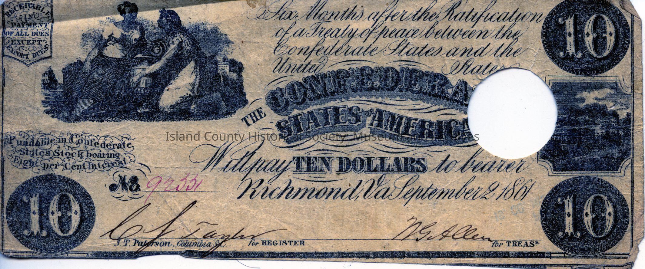 Confederate $10.00 dollar bill. No other information about where the money came from and was found in collection. Bill features an image of Ceres, Ceres, and a train. The money list J.T. Paterson of Columbia, SC as Register.