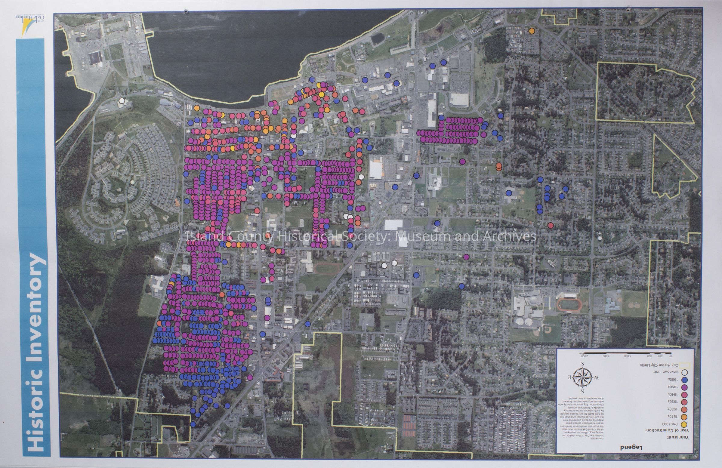 Historic Inventory Map of the City of Oak Harbor. This map features a legend of historical buildings from Pre-1909 to 1960 within the Oak Harbor City Limits. The map contains 7 different colors dots that represent the year the building was built. Within the legend is a disclaimer which states: Neither the City of Oak Harbor nor any agency, officer, or employee of the City of Oak Harbor warrants the accuracy, reliability or timeliness of any information contained on mapping products originating from the City of Oak harbor and shall not be held liable for any losses caused by such reliance on the accuracy, reliability or timeliness of such information. Any person or entity who reies on any information obtained does so at his or her own risk.Lexicon