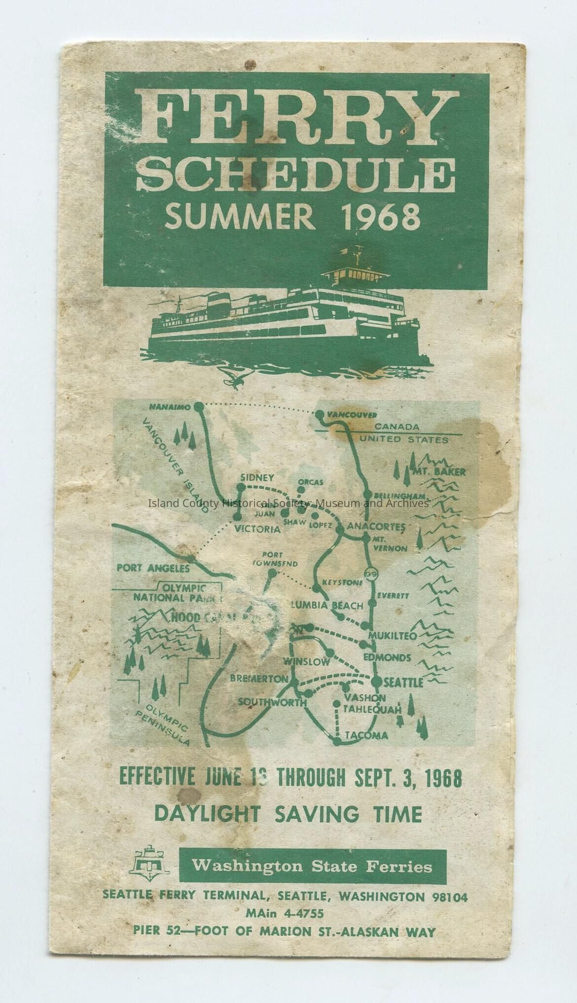 A green and white brochure that folds open and lists the ferry schedule and costs in 1968Collection