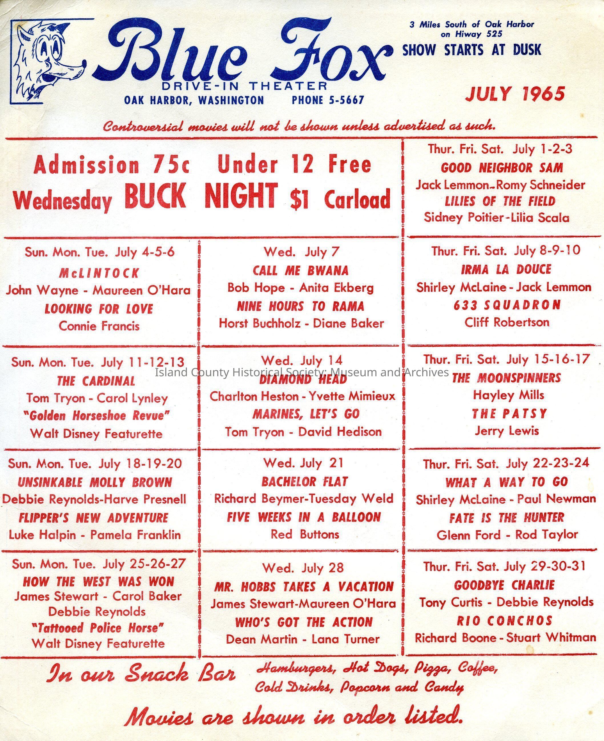 Blue Fox Drive In advertisement for the drive in in Oak Harbor