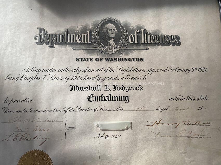 A liscence for embalming for Marshall Hedgcock, who was a mortician. Marshall's twin brother Marion owned the Hedgcock funeral home and was the mortician there. Marshall would fill in for Marion every summer when Marion went on vacation.