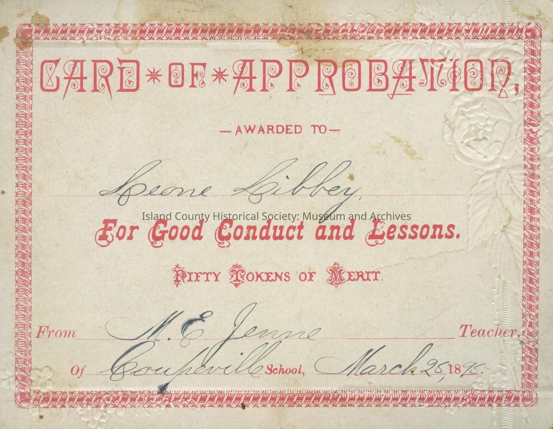 A certificate awarded to Leona Libbey on March 25 1895 for good conduct