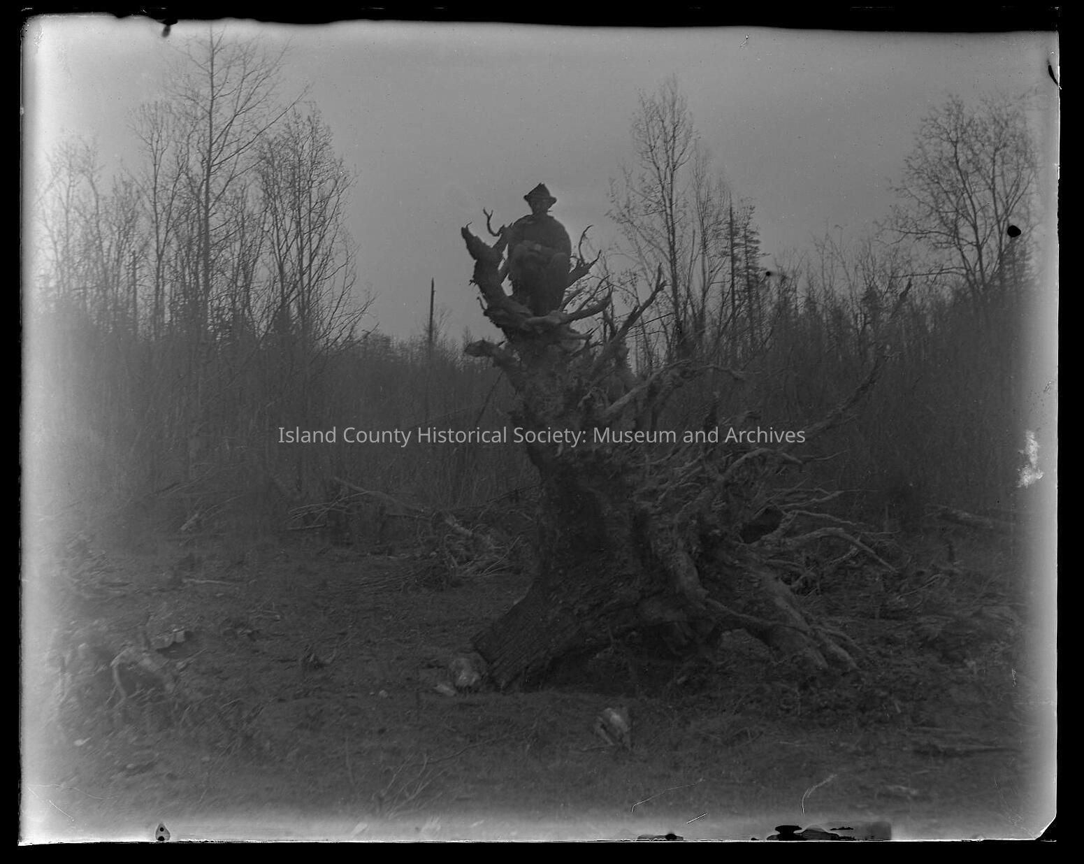 Unidentified man sitting on a uprooted treeCollection