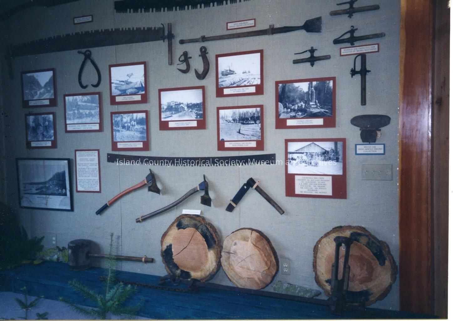 A color photo of a wall in the Museum of an exibit of pictures of logging, sawmills, etc. and lgging tools: saws, clamps, drills, axes, etc. Below are tree trunk cuts - live edge cross sections. Stamped on the back: Herbert Pickard.Lexicon