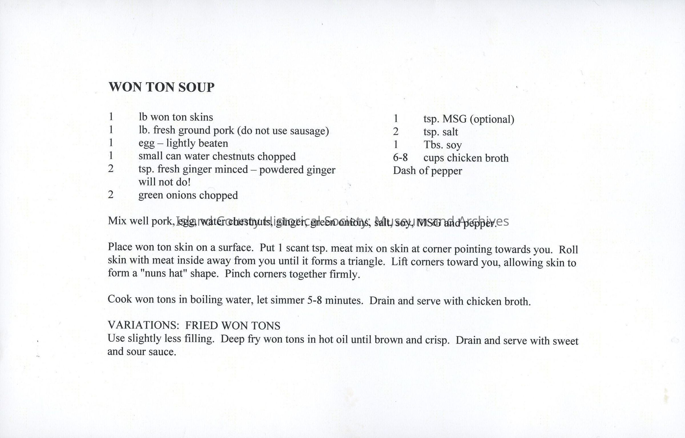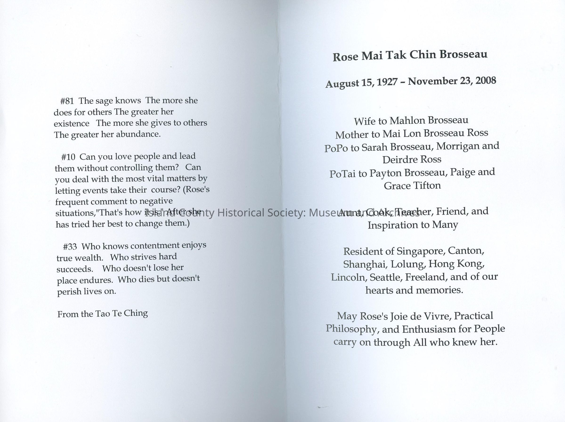 Rose Mai Tak Chin Brosseau funeral pamphlet obituary. Includes a recipe for wanton soup on the back.