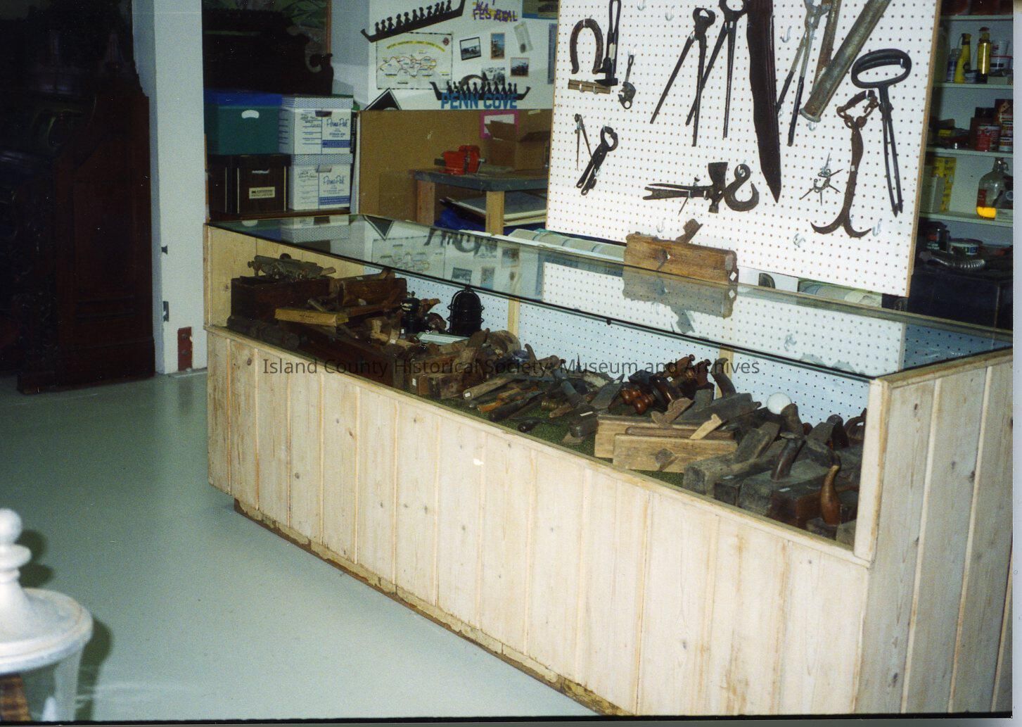 A color photo of a light wooden display case with logging and carpentry tools inside. On the peg board behind the case are additional logging and other tools. Other items and boxes are on shelves or on the floor. In the foreground are two large round items with knobs on the top.