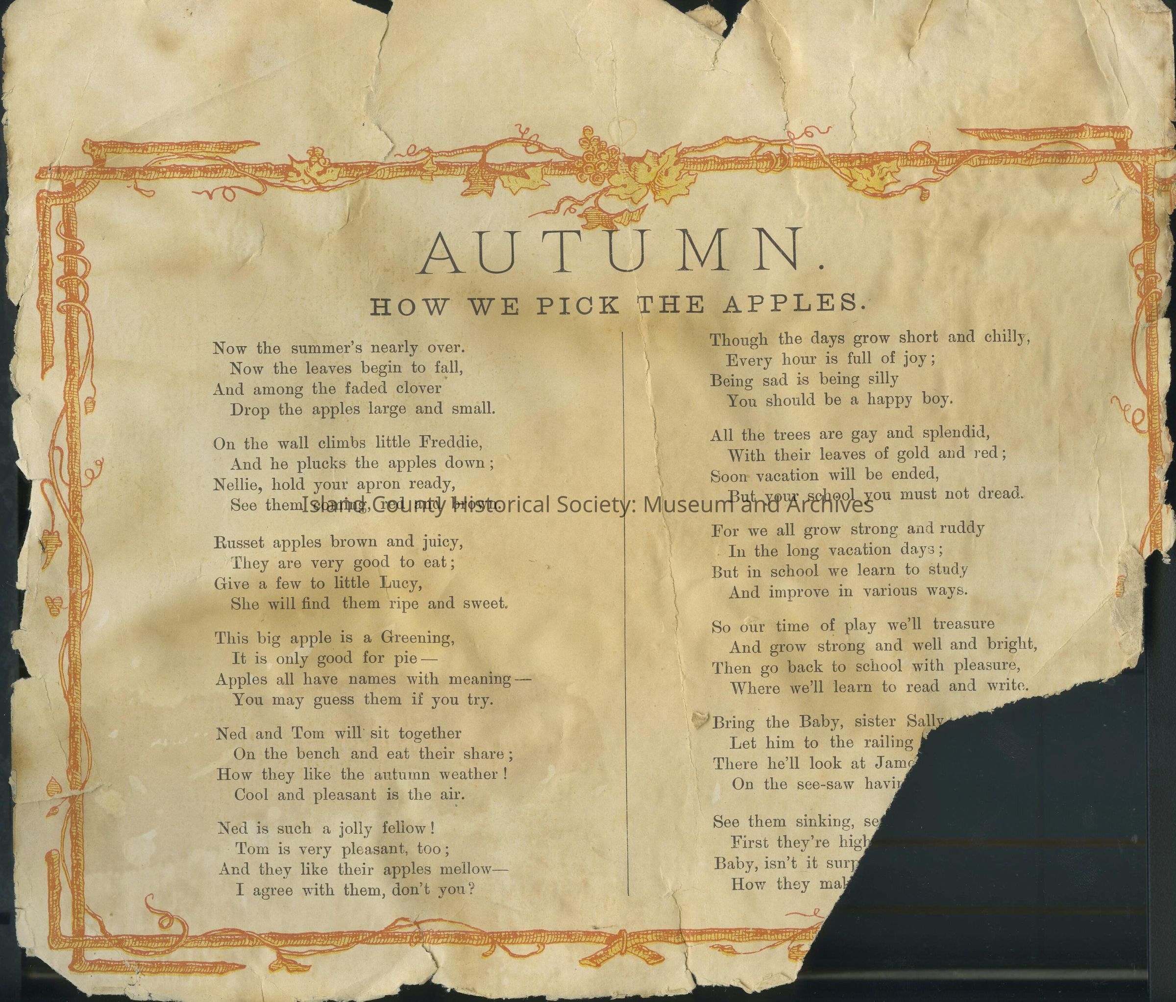 A poem about Autumn apple picking with a note on the back that reads "Keep this! Mary Libbey got this for Thomas when I was six"