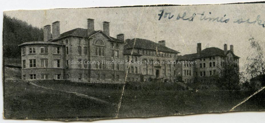 Photo of a huge building - dorm? On the top is written: "For old time's sake"