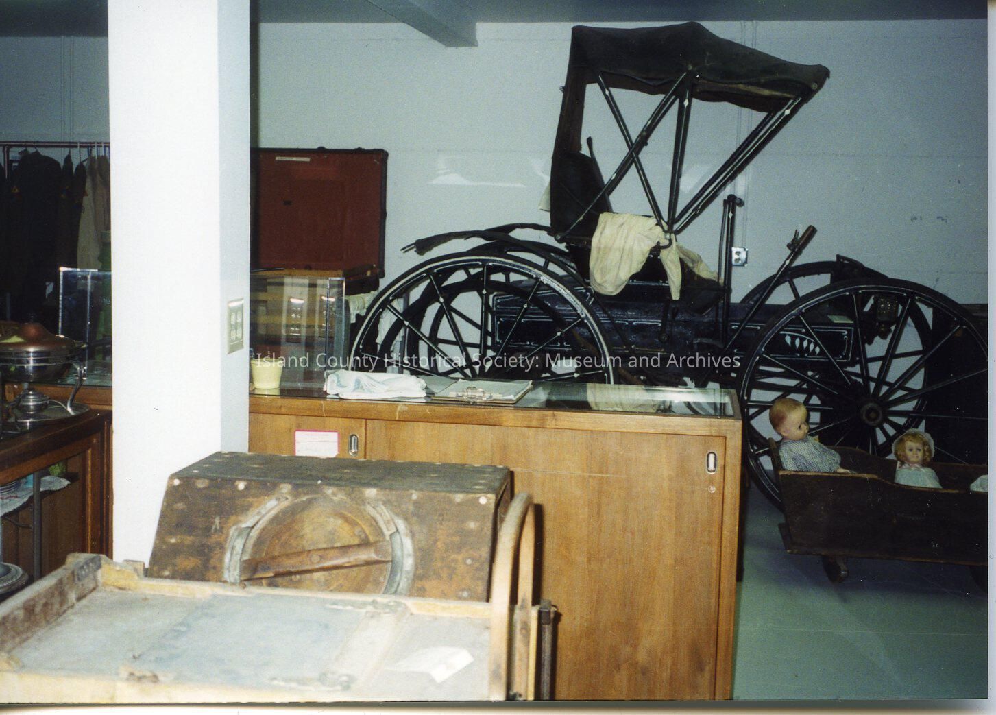 A color photo of the Holsman car. Beside the front passenger wheel are two dolls in a cradle. A display case is in the foreground and to the left, on either side of a white column. Clothes are on a rack in the far left backround. Other items are on and inside the display case.