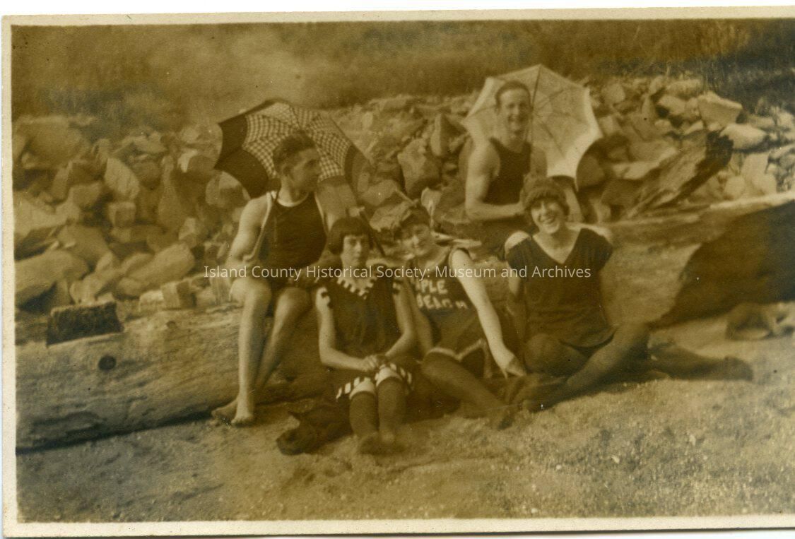 Photo of five young people on a beach wearing swimsuits Three women are sitting in the front, one with lettering: Maple Beach. The two men are sitting on the log behind them holding parasols.