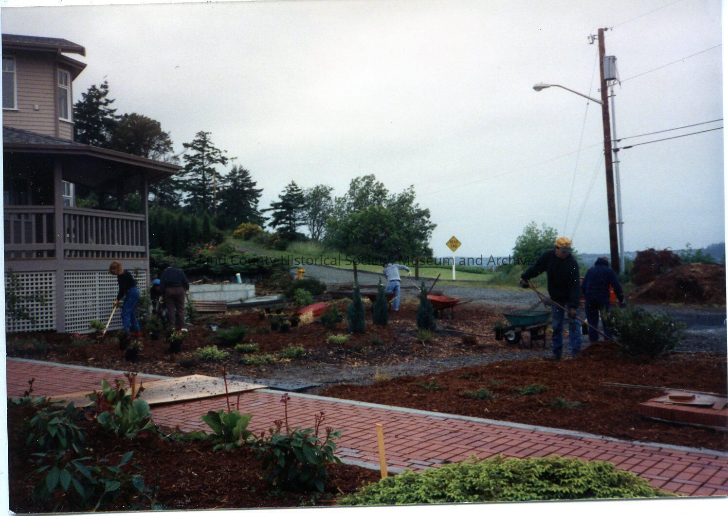 A color photo of about 6 people working on the garden in front of the ICHS museum on Alexander Street, Coupeville. The brick path is complete. Bushes and flowering plants have been planted and mulch is being added.