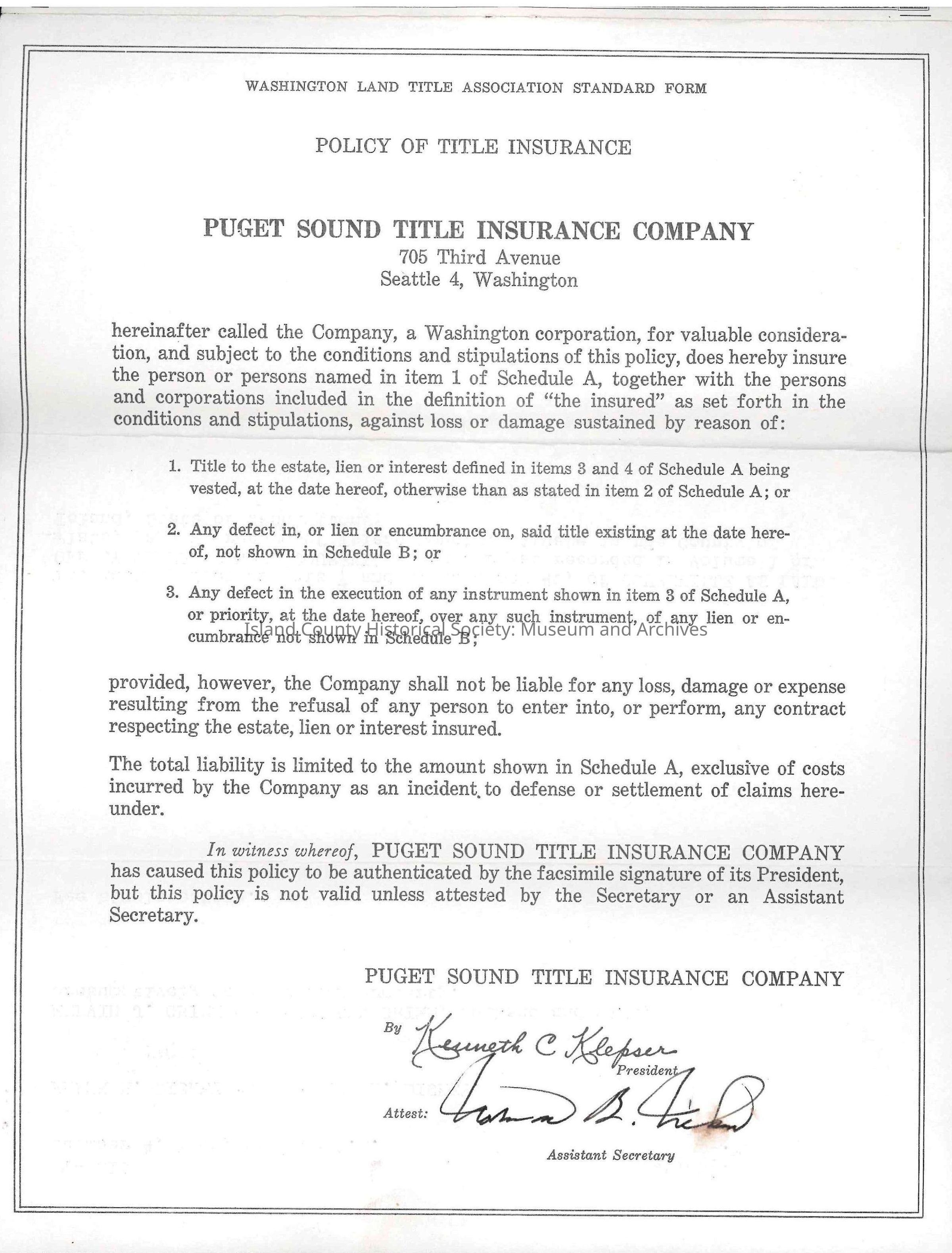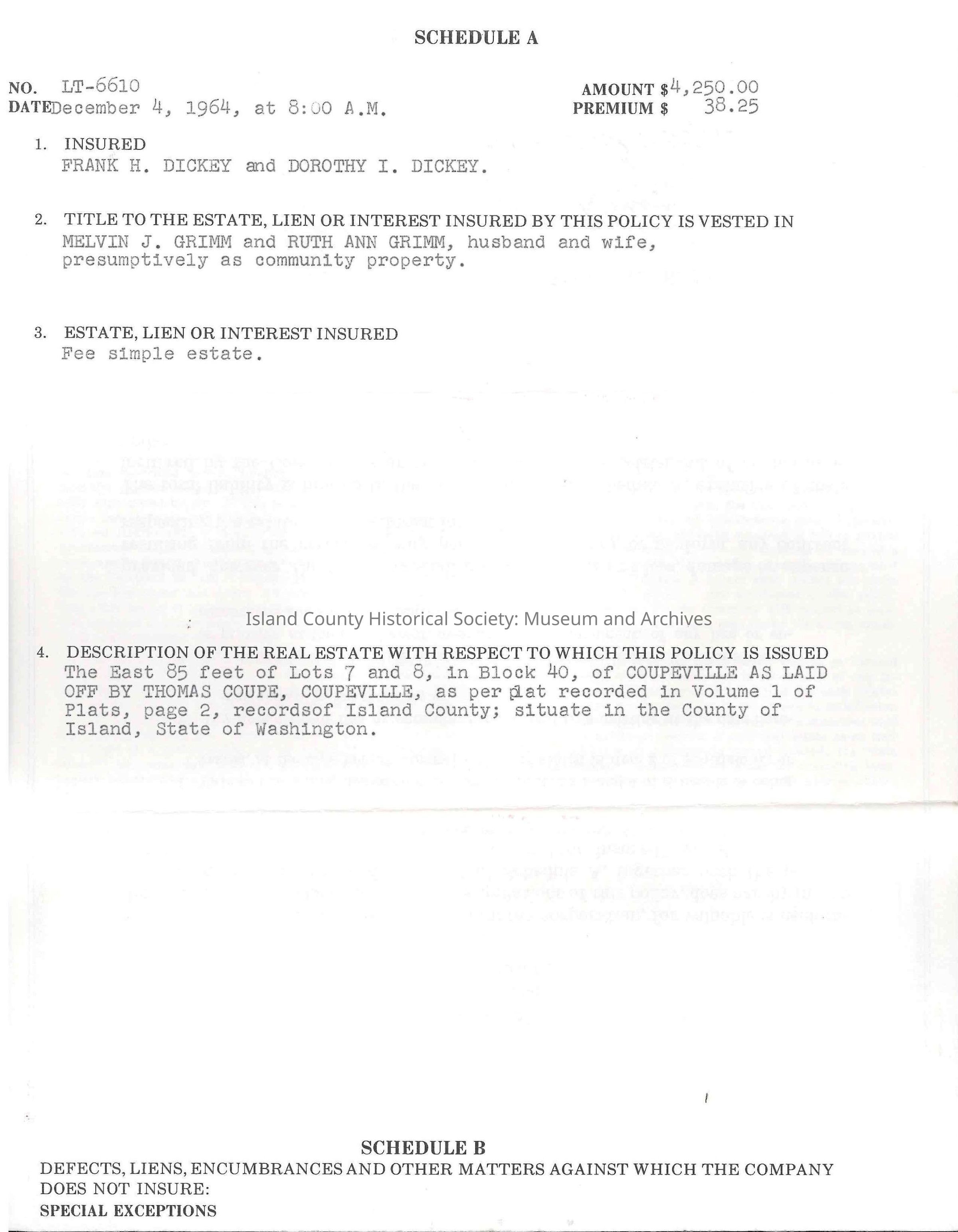 Title Policy issued to Frank and Dorothy Dickey, insuring real estate purchased from Melvin J. Grimm and Ruth Ann Grimm, as follows: "The East 85 feet of Lots 7 and 8, in Block 40, of Coupeville as laid off by Thomas Coupe, Coupeville, as per plat recorded in Volume 1 of Plats, page 2, records of Island County; situate in the County of Island, State of Washington."