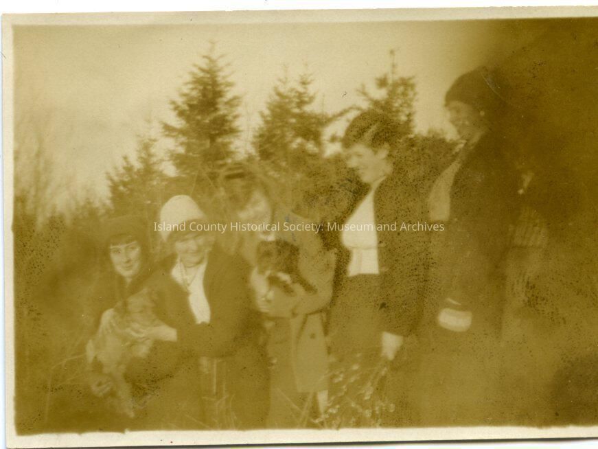 Photo of six young women laughing and two are each holding a dog. On the back: All six and two dogs