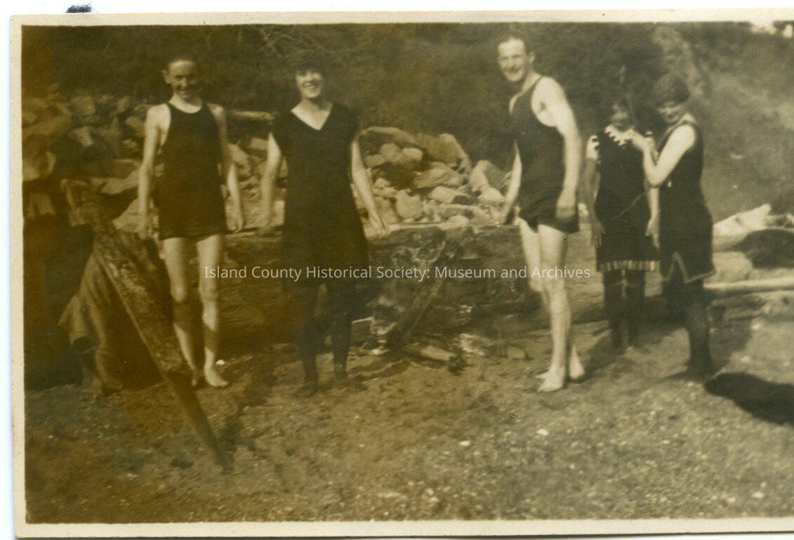 Photo of six young people on a beach - two men and three women. On the back: Rex posing