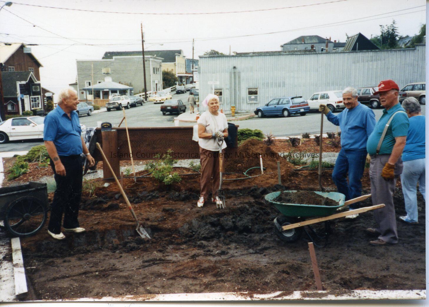 A color photo of the garden in front of the ICHS museum on Alexander Street, Coupeville. The brick path is complete. Bushes and flowering plants have been planted and mulched. Three men and two women are standing in the herb garden; they are holding various tools. Two men are standing in front of or behind two wheelbarrows. The museum sign is installed; a jacket and tools are on it. The view is toward the street. Written on the back (names behind the person on the front - so reading left to right): Jack Ross, with wheelbarrow, Barbara Chapman, Tom Chapman, Nadine Ross.Made/Created