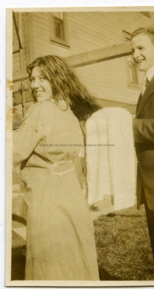 Photo of a man drying a woman's hair - they are outside. She is wearing a robe. He has on a suit On the back: Harry & Russ