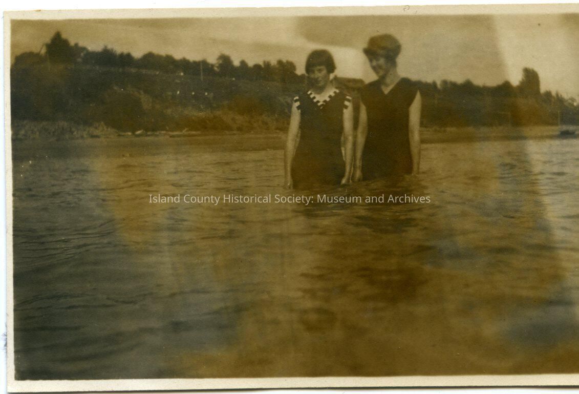 Photo of two women standing beside each other in the water; they are wearing swimsuits and hats. On the back: Squalicum Beach (near Bellingham)