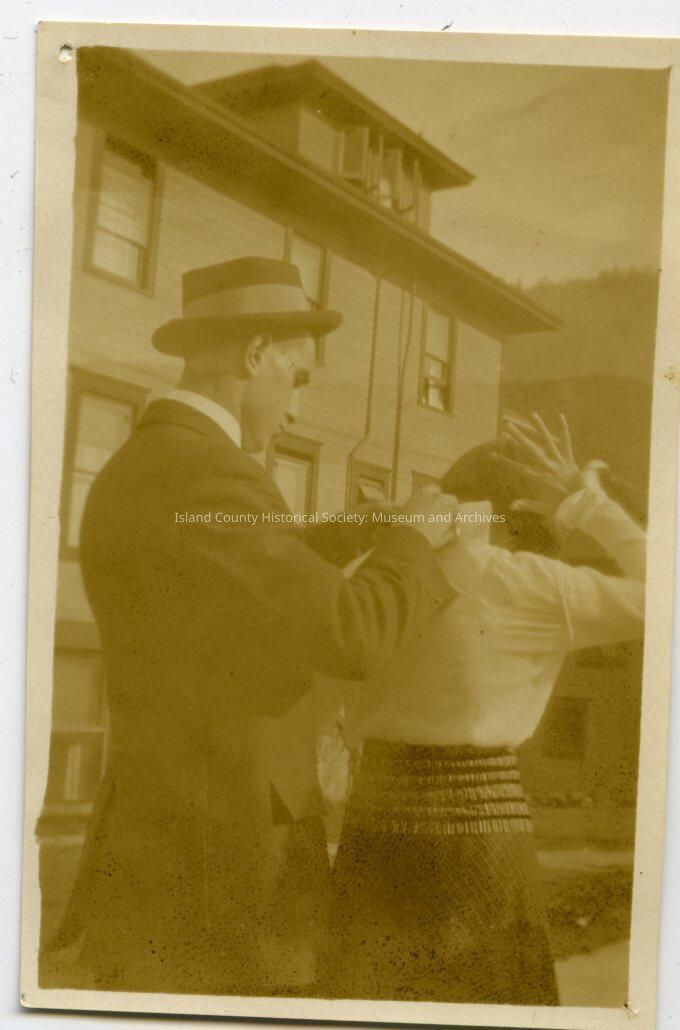 Photo of a man pinning something up on a woman's nape. He is wearing a suit and hat; she has on a blouse and skirt. On the back: Pinning it up