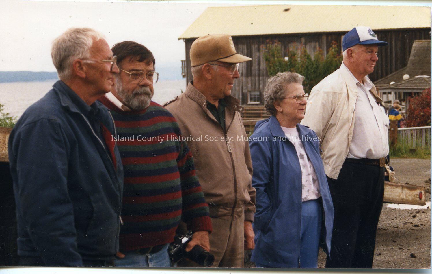 A color photo in front of the ICHS museum on Alexander Street, Coupeville. Four men and a woman, some wearing a jacket, hat or sweater, are facing the canoe shed. On the back: Del Bennett, Herb Pickard, Murrieal Short, Bud Merriman. Museum ground breaking 6-89.Made/Created