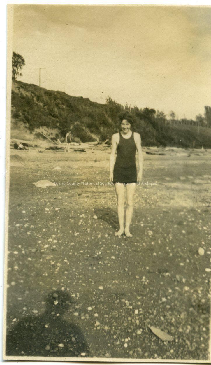 Photo of a man on a beach in a bathing suit. On the back: Rex Harper