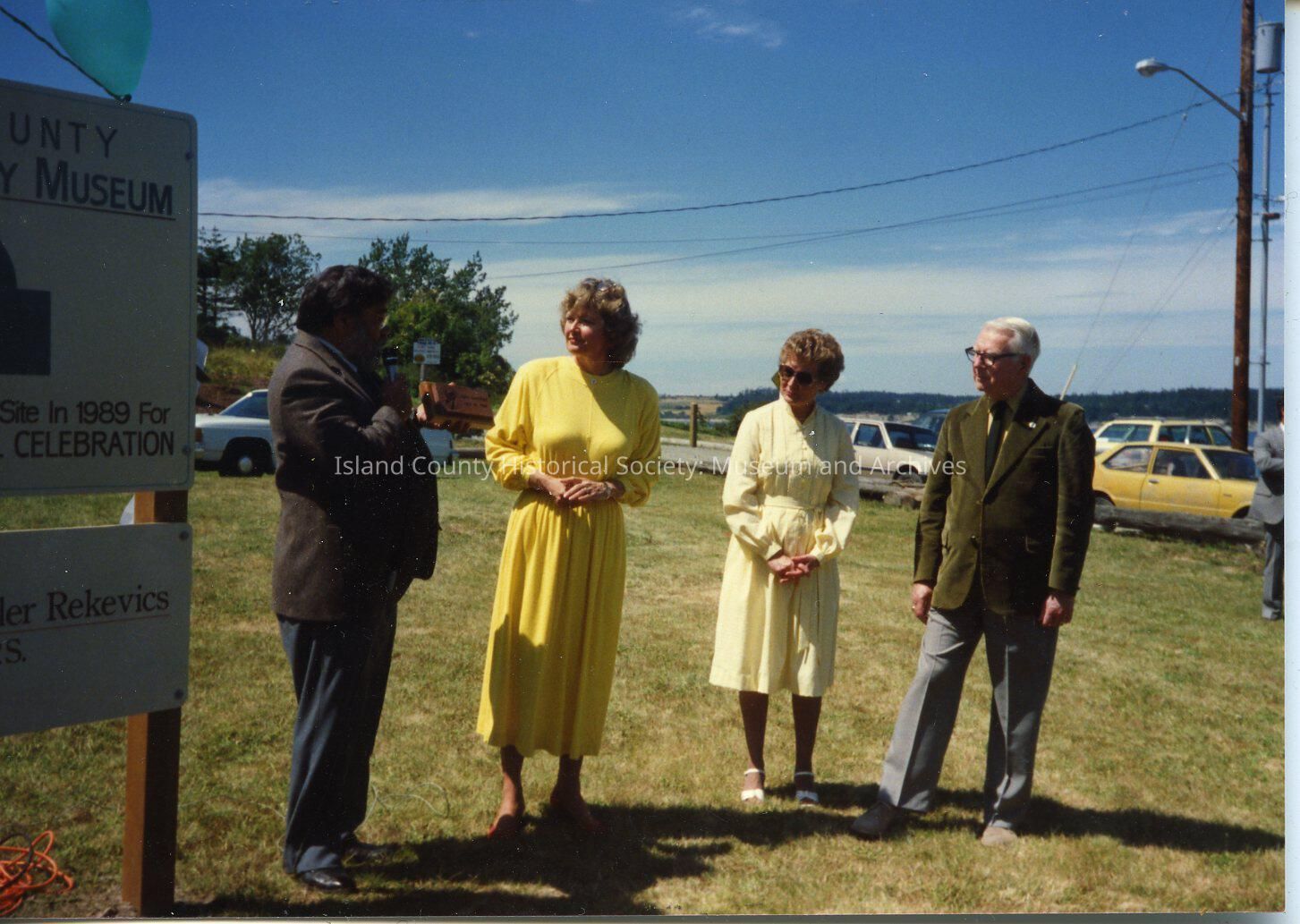 A color photo in front of what will be the ICHS museum on Alexander Street, Coupeville. Two women and two men are standing beside a sign on the site for the museum. Cars are on the road to the side - what is now just a path. On the back: Del Bennett, Jean Gardener, Betty and John Coyne.Made/Created