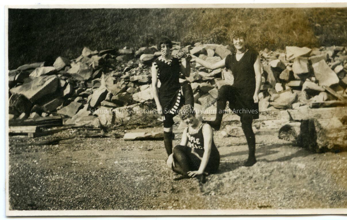 Photo of a three young women on a beach wearing swimsuits. One suit has "Maple Beach" on it.