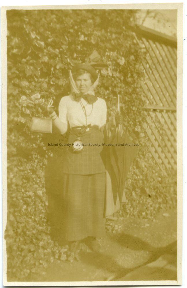 Photo of a young woman wearing a long top and skirt, scarf tied around a hat; holding an umbrella, small purse, large watch on a chain, coat over her arm, button-up boots or shoes, leather gloves. She is standing beside a dirt drive and lattice fence. On the back: JimmieMade/Created