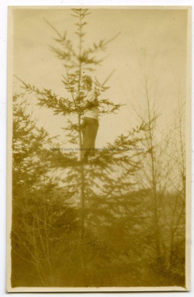 Photo of a young man standing in a tree. On the back: Buster tree'd