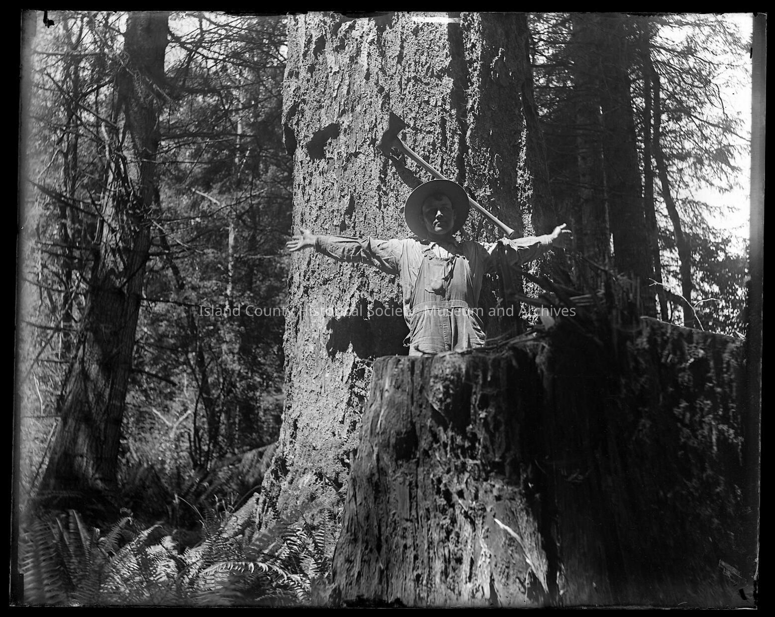 Man with arms outstreched behind tree stumpCollection