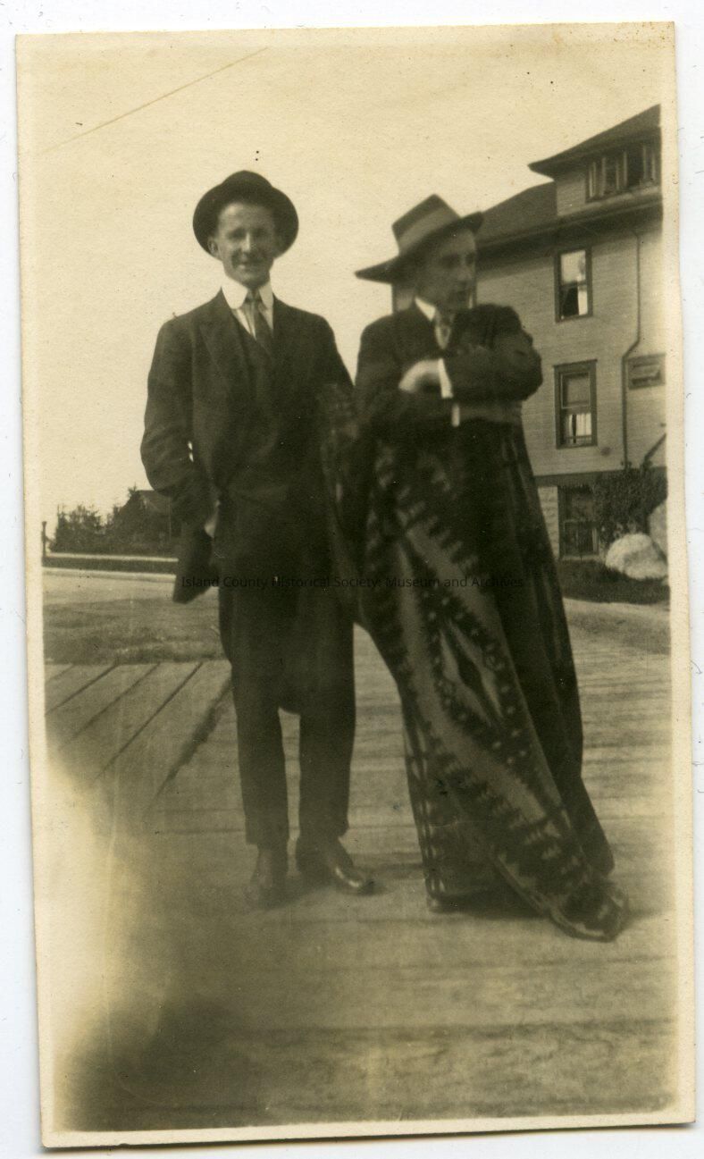 Photo of two young man in suits, one holding a blanket. They are beside a building and on a planked walkway. On the back: Lake Padden or bust!