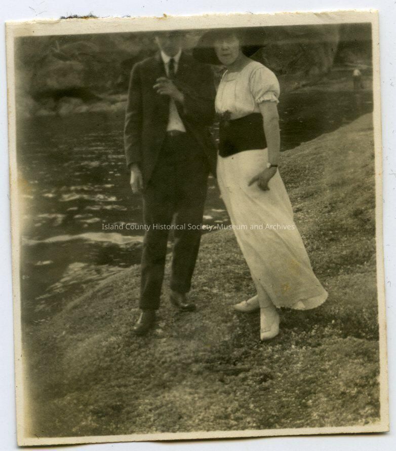 Photo of a young man and woman - he is in a suit, she in a dress with a wide sash. Standing on grass near water. On the back: Leonard Fiske & Dutch