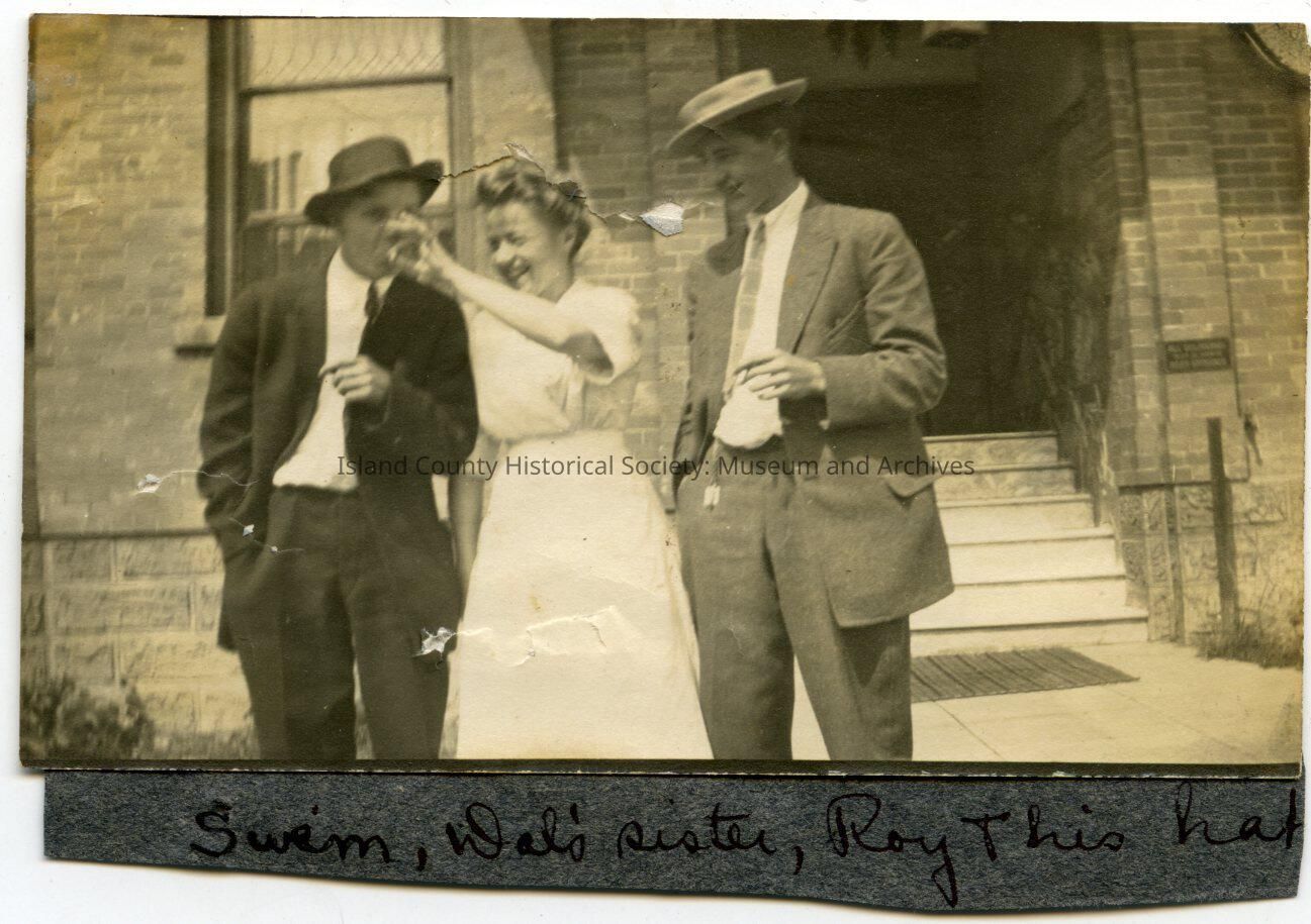 Photo of two young men and woman - they are in suits, she in a dress. Standing in front of a building, On the bottom: Swem, Dal's sister, Roy & his hat