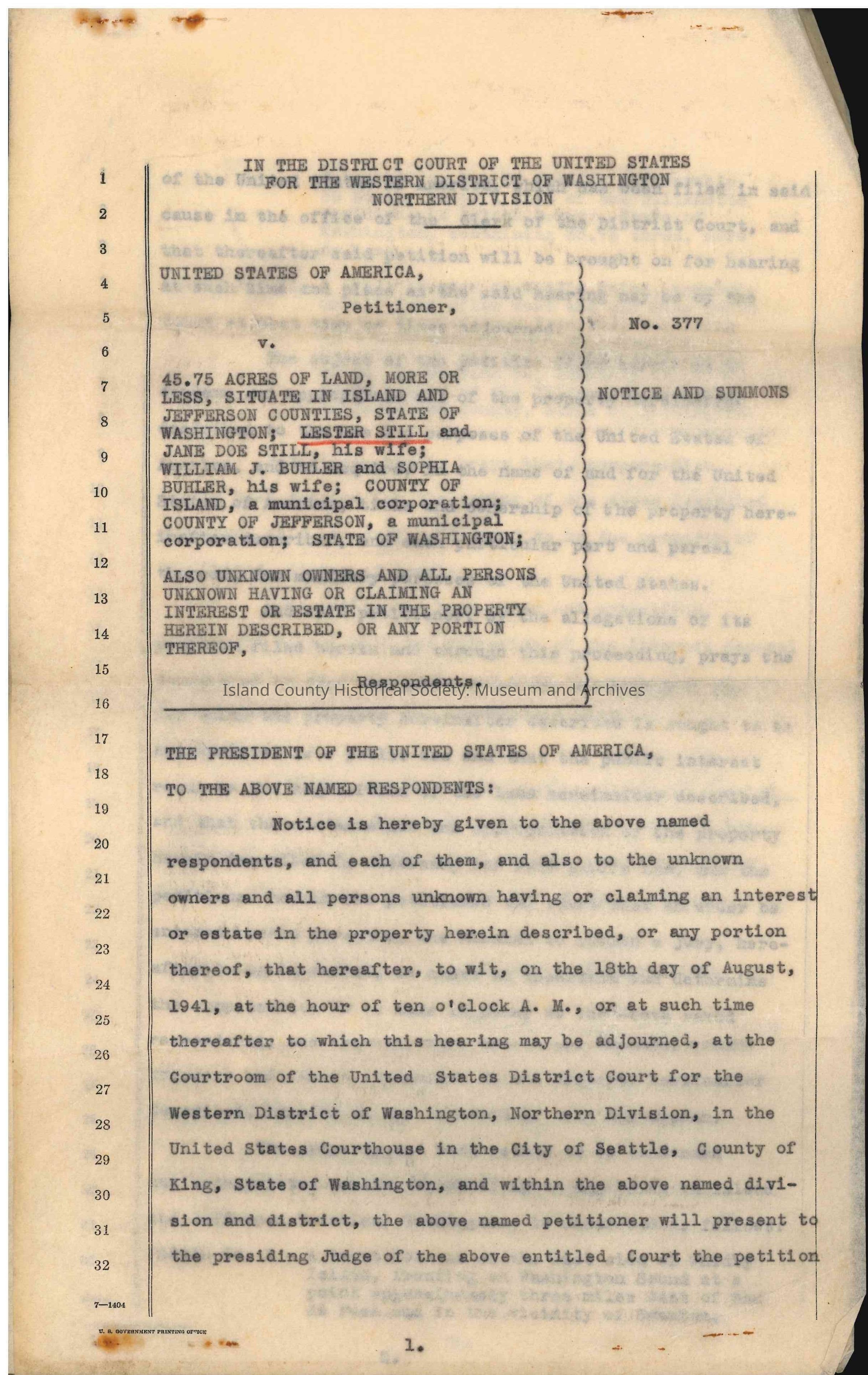 Notice and Summons from the District Court of the United States to Lester Still, "Jane Doe Still", William J. Buhler, and Sophia Buhler.Collection