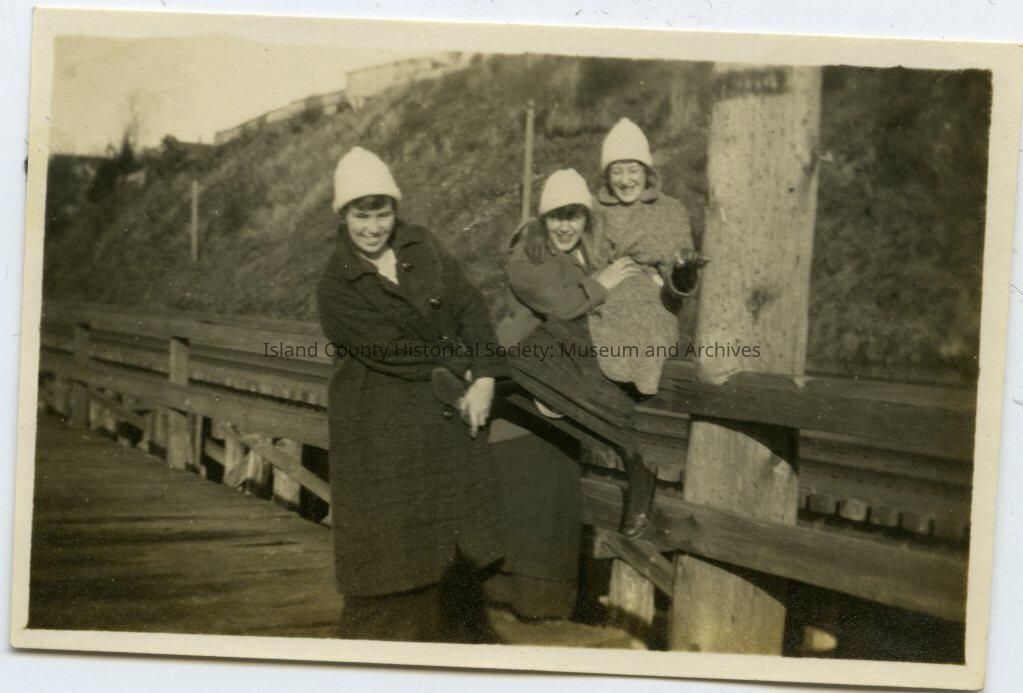 Photo of three young women standing or sitting on a fence probably beside a train track. On the back: Pulling out the ihumatics (sic)